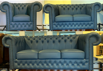Chesterfield Lord kékes, szürke bőr ülőgarnitúra 3+2+1. Ülőgarnitúra méretek: Fotel: 110cm x 75cm x 95cm Duplafotel: 160cm x 75 cm x 95 cm 3-as kanapé: 200cm x 78 cm x 95 cm